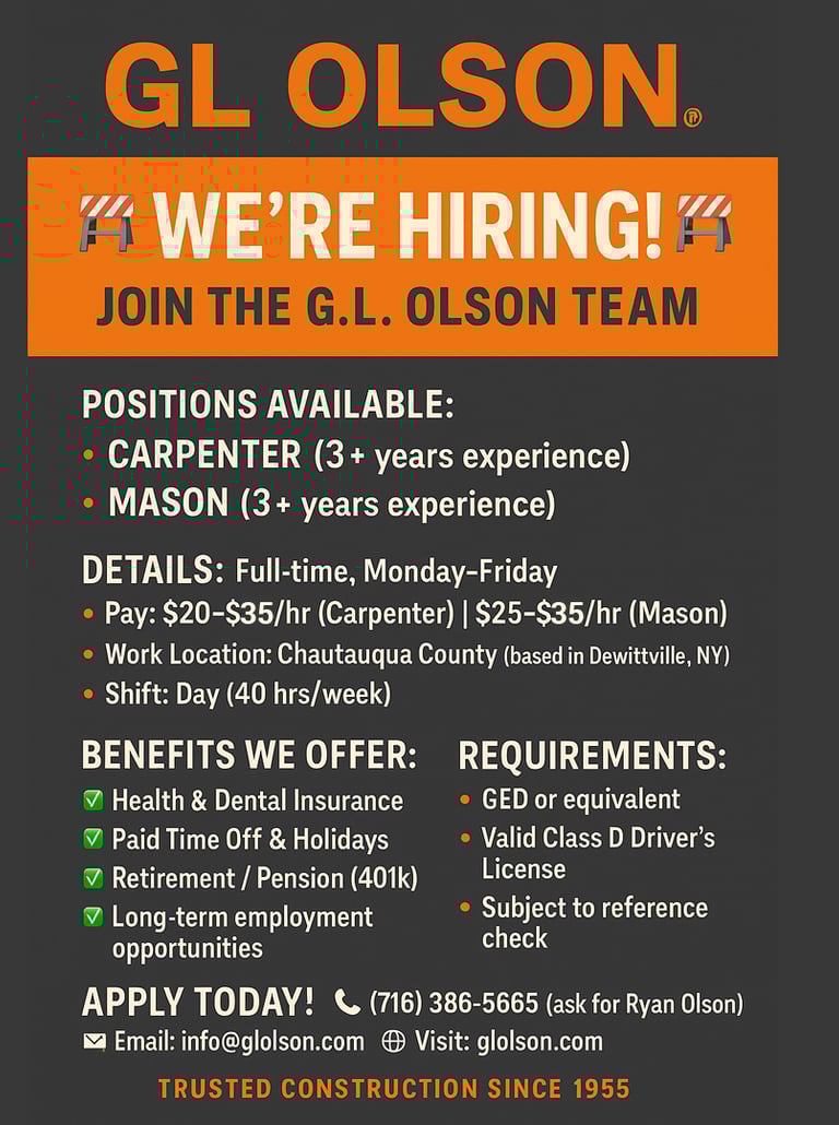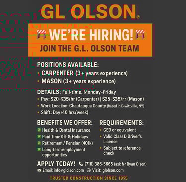 GL Olson Construction is committed to being Western New York and Northwest Pennsylvania's most trusted and skilled construction partner, owned and led by seasoned professionals with an unwavering dedication to excellence. Our six decades of expertise and experience across diverse commercial and industrial markets, combined with our comprehensive self-perform capabilities and deep-rooted community partnerships, deliver exceptional quality and value to every project we undertake.